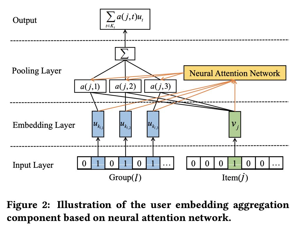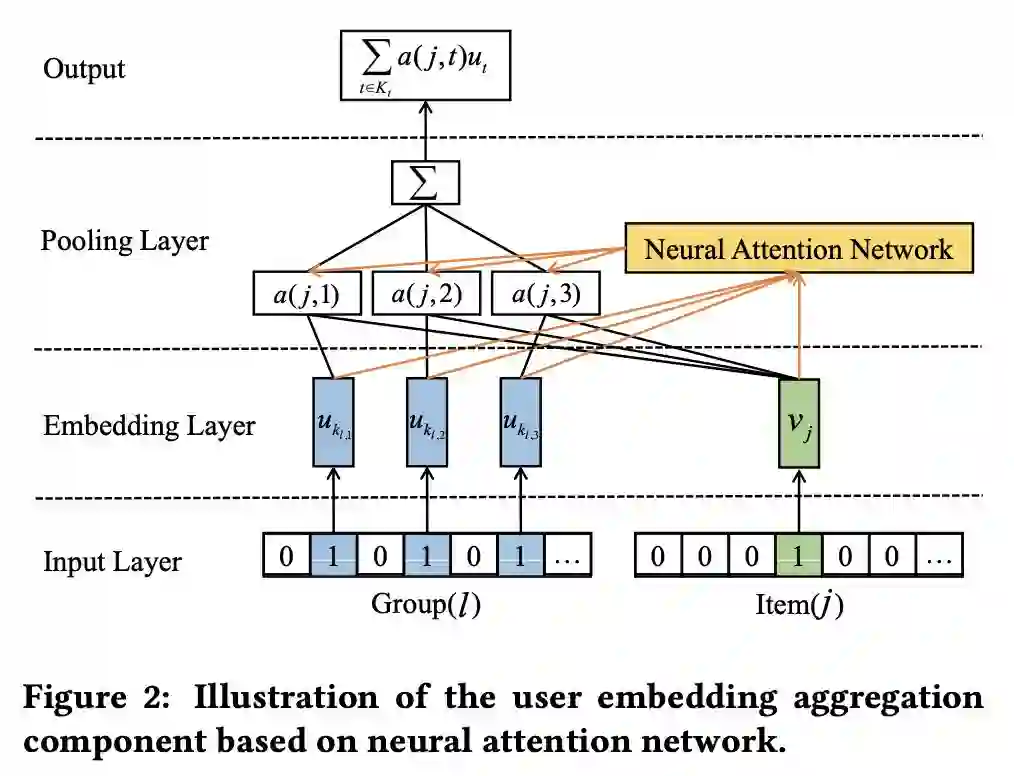 本文是湖南大学和新加坡国立大学发表于 SIGIR 2018 的工作,论文应用神经协同网络和注意力机制为群组用户进行 Top-N 商品推荐,主要解决了群组用户兴趣的动态组合、群组与个人用户的协同商品推荐,以及新用户的冷启动问题。