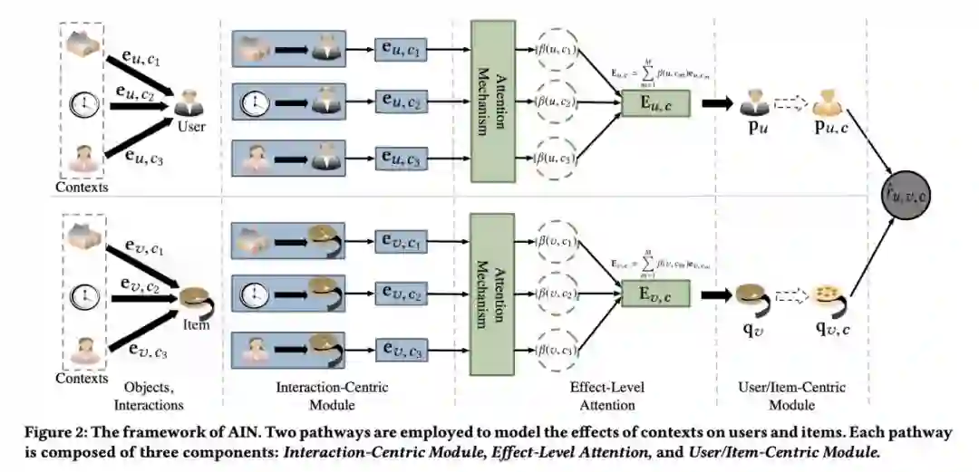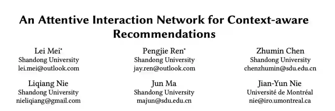 本文是山东大学发表于 CIKM 2018 的工作,论文关注的问题是基于上下文感知的推荐系统。作者提出了一种新型注意力交互网络,用来捕捉内容、user和item之间的交互影响。此外,作者还提出了一种效应级注意力机制来聚合多种交互影响。通过在三个公开数据集 Food、Yelp 和 Frappe 上的大量实验表明,本文模型效果优于当前最先进的上下文感知推荐算法。