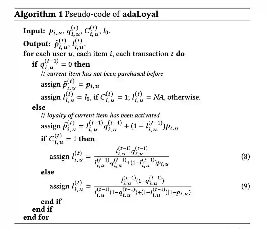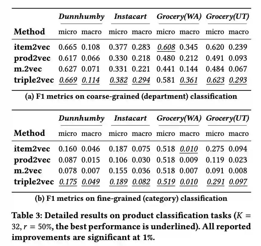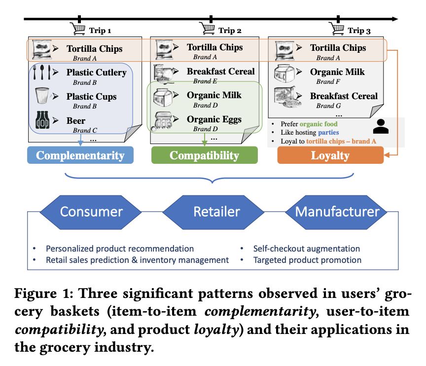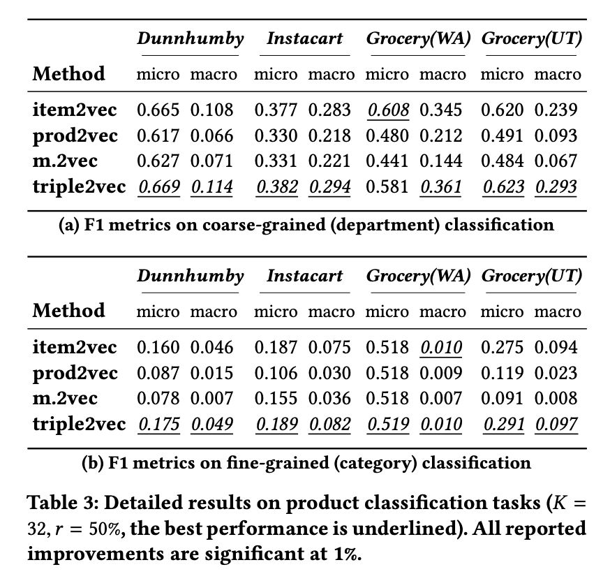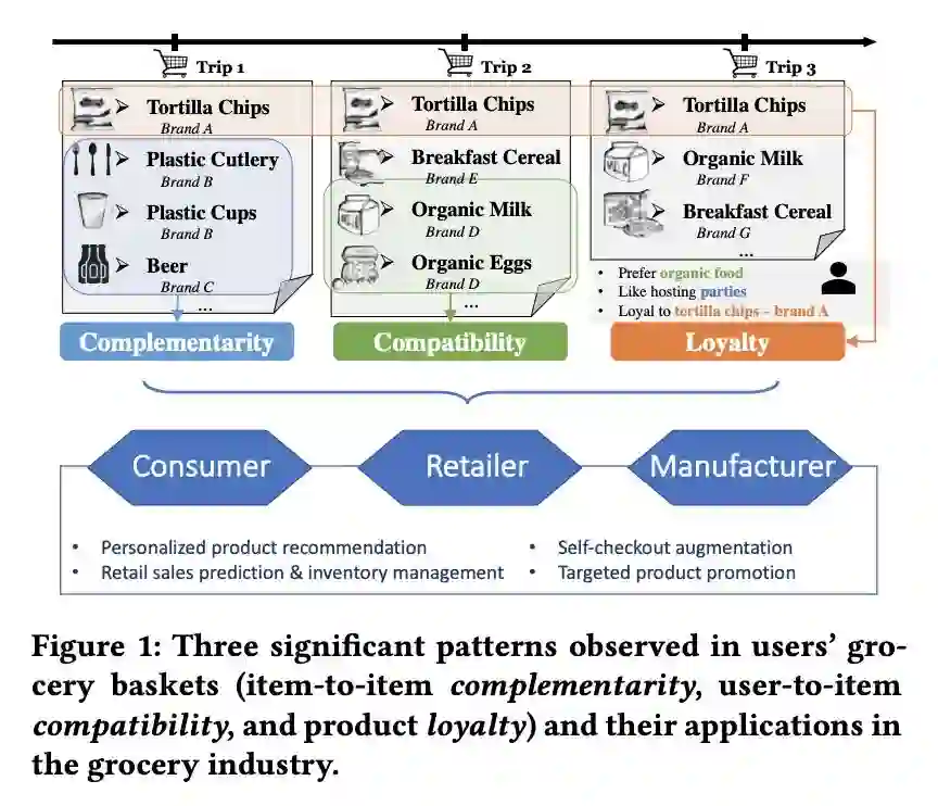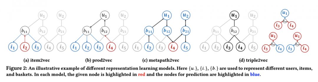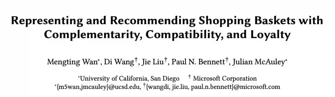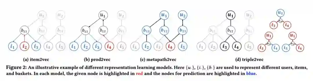 本文是 UCSD 和微软发表于 CIKM 2018 的工作。与在线购物不同的是,在超市购物场景下,商品间的互补性和用户对商品的忠诚度起着决定性作用。本文基于这两个维度提出了一种新的表示学习方法——triple2vec。此外,作者在上述方法得到的表示基础上,提出了一种考虑忠诚度的推荐算法,用忠诚系数来权衡表示模型和统计模型计算出的购买偏好。