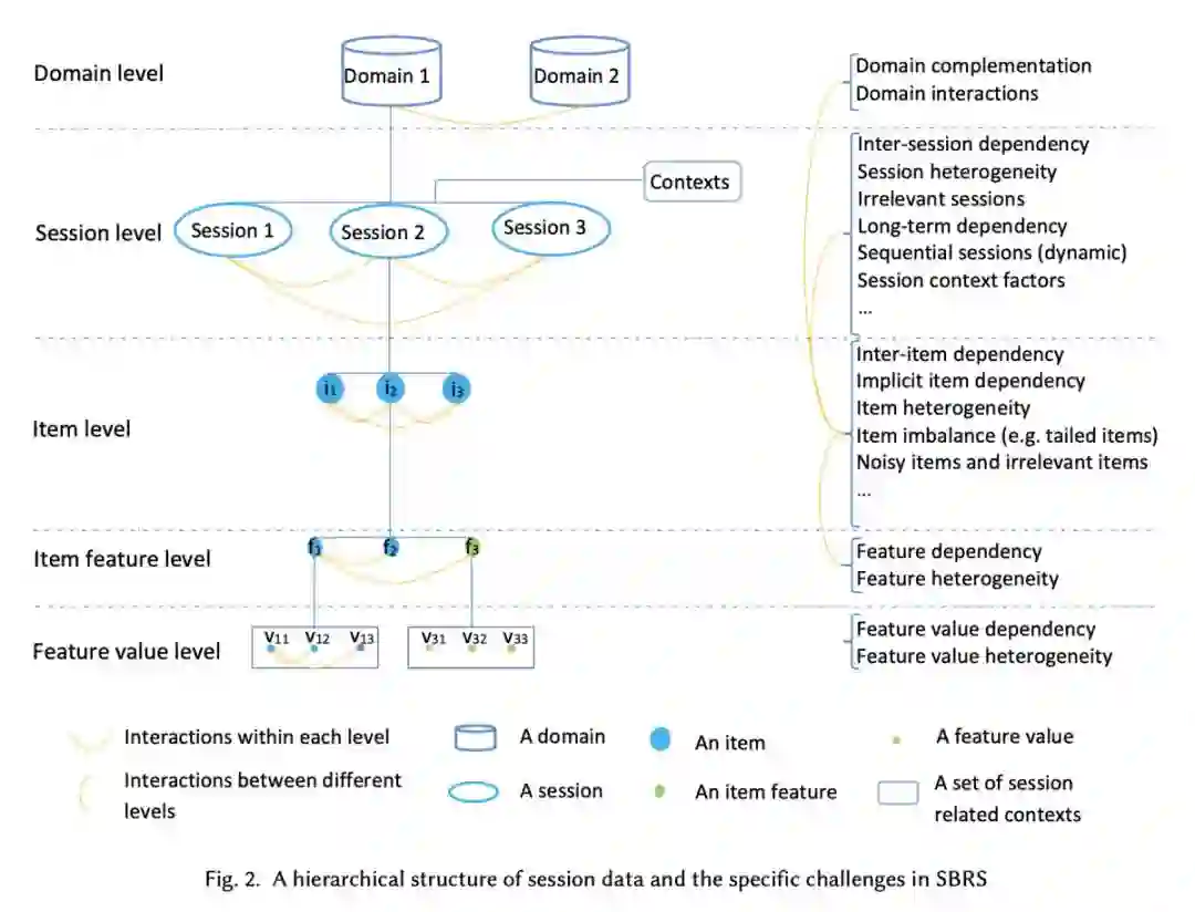 该文从问题本质和相关的数据特征入手,为 session-based recommendations 建立了一个层次化模型来深入理解里面存在的各种数据复杂性和潜在挑战,然后采用了两个不同维度对现有研究成果进行了系统分类和总结,最后提出了展望。