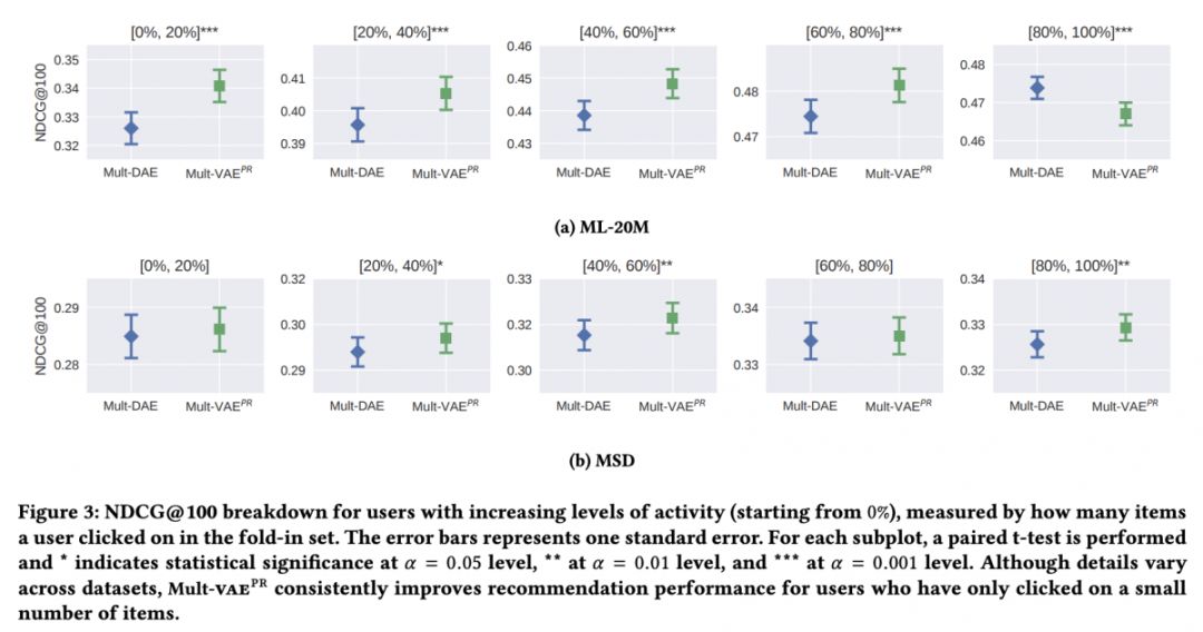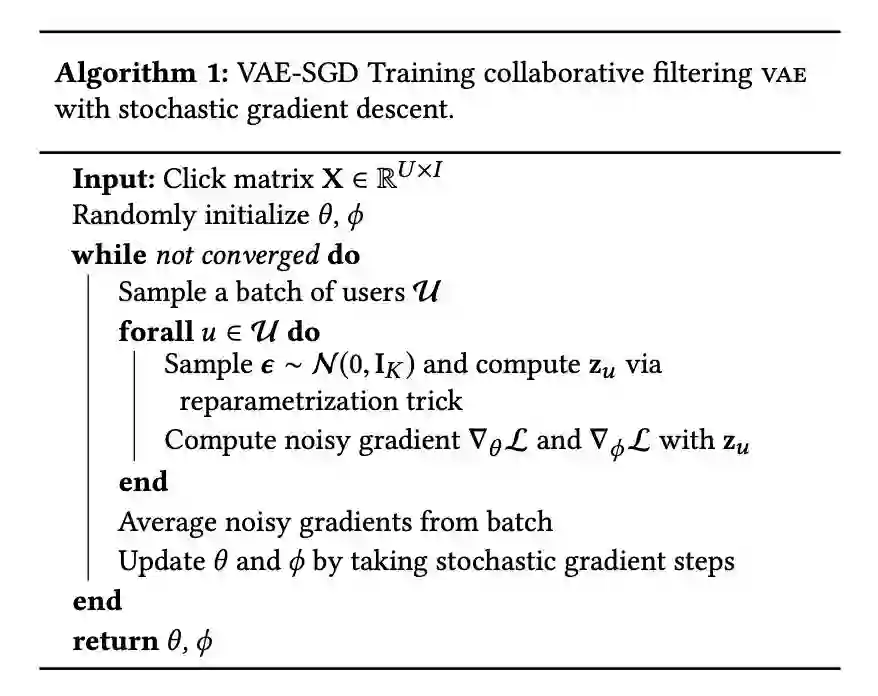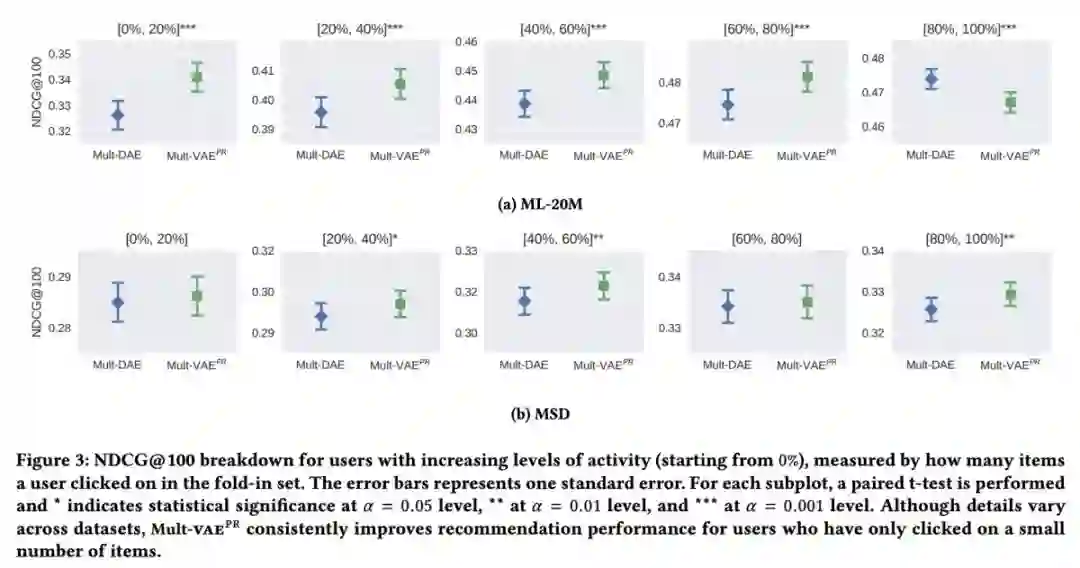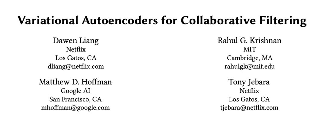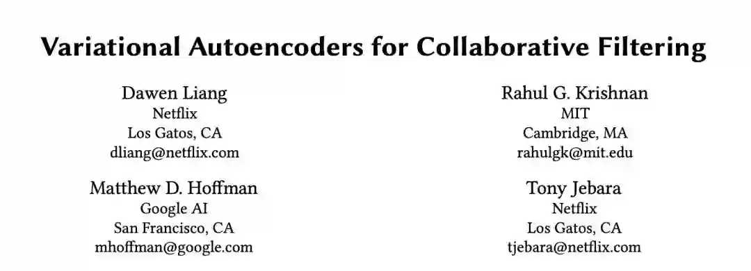 本文是 Netflix、MIT 和 Google AI 发表于 WWW 2018 的工作,论文将变分自编码器(VAE)扩展到协同过滤以进行隐式反馈,通过非线性概率模型克服线性因子模型的局限。其次,作者引入了具有多项式似然(multinomial likelihood)的生成模型,并使用贝叶斯推断进行参数估计。作者基于 VAE 提出了一个生成模型 VAE_CF,并针对 VAE 的正则参数和概率模型选取做了适当调整,使其在当前推荐任务中取得最佳结果。
