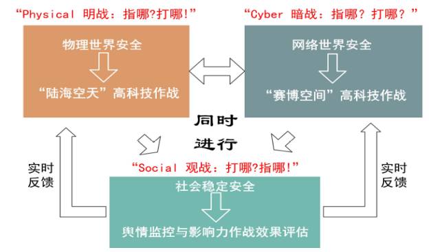 跨域作战的主要表现是以无人武器为核心的“明战”、以网络武器为主导的“暗战”,及以社会媒体为手段的“观战”之有机战略组合。