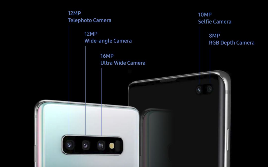 后置相机部分,Galaxy S10+ 采用了三摄设计,主摄 1200 万像素,F1.5/F2.4 可变光圈,支持光学防抖,2 倍焦距长焦头为 1200 万像素,F2.4 光圈,支持光学防抖,另外一颗是视角达到了 123 度的 1600 万像素超广角头。