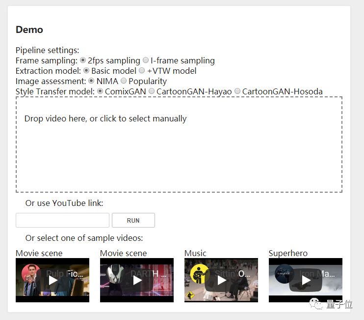 体验Demo时,可以自己上传视频,也可以选择YouTube中的视频。当然,他们也提供了一些样本视频,可以直接体验。