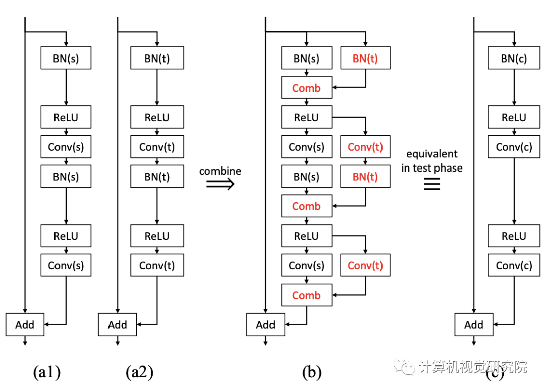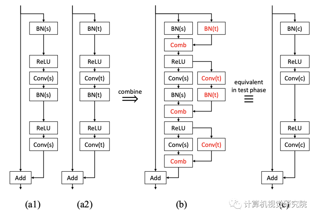 新提出的方法可以自然地应用于BN层。我们不需要担心分布的变化,因为每个子网都有自己的BN层来完成自己的任务。具体地,图中的原始BN层(下图的BN(s))应在额外的训练和测试阶段使用其源任务的人口统计。否则,一些源知识就会丢失,因为联合网络在额外的训练中无法看到和利用原始统计数据。具有组合层的两个BN和两个卷积层在训练后也可以合并成一个等效卷积层,因为BN层在推理阶段是确定性的线性层,卷积也是线性运算。