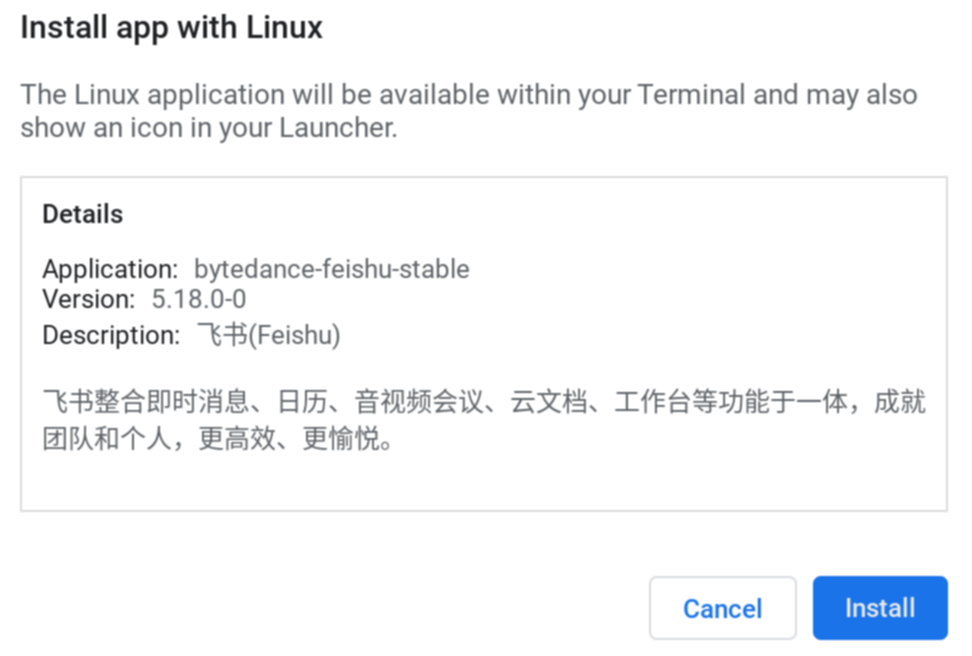 接下来就是迁移工作流,总体上还算顺畅,主要是一些惯用的库或 IDE 目前仍旧缺乏 Linux Arm 支持,如 Pycharm 等,也难怪 VScode 在自带的应用商店里被列为 Essentials 的第一项。这个主要就是看各家对于 arm 生态的支持如何。以飞书为例,就可以直接在官网下载到 .deb 格式、支持 arm64 的安装包,双击打开后的安装过程也极为友好,与寻常桌面系统安装软件无异,不熟悉命令行的用户不用担心。