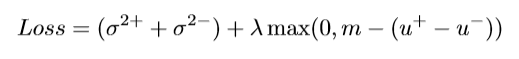 双路径模型(GIN)的最后一层,将前面两条路径的输出作为输入进行点乘运算,其输出为文本对的相似性分数。作者定义的损失函数,通过最大化匹配对的平均相似分数u+,最小化非匹配对的平均相似分数u- ,同时最小化匹配对的相似性分数的方差sigma^{2+} 和非匹配对的相似性分数方差sigma^{2-}, 将损失降到最小: