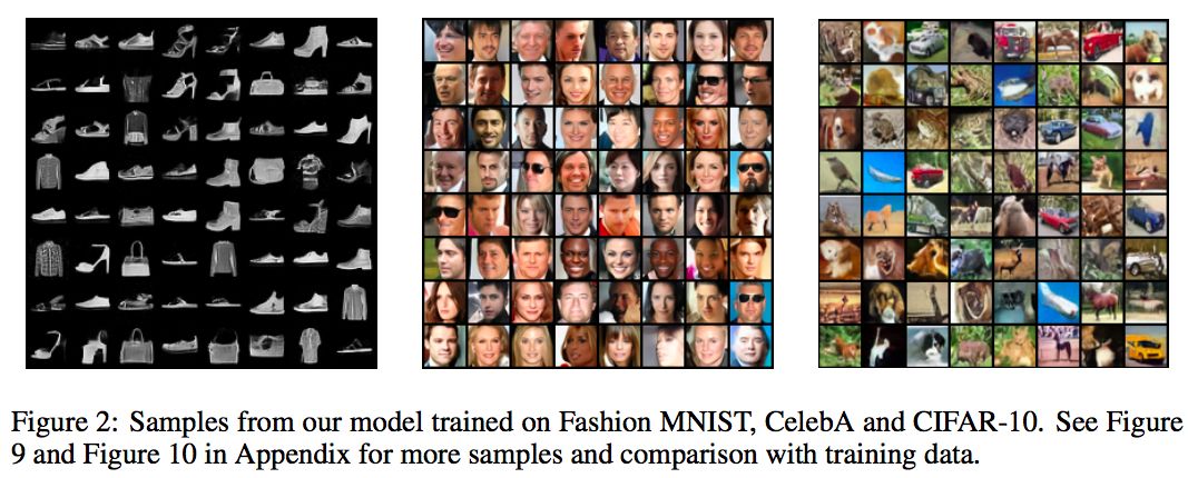当然,论文还有很多细节,论文的核心技巧是用了退火技巧来稳定训练过程,提高生成质量,但笔者对这些并不是很感兴趣,因为我只是想学习一些新奇的生成模型思想,拓宽视野。不过不得不说,虽然做法有点粗暴,这篇论文的生成效果还是有一定的竞争力的,在 fashion mnist、CelebA、cifar10 都有相当不错的生成效果: