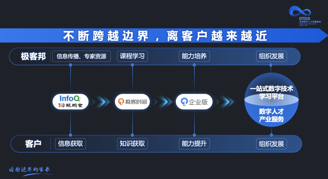极客邦希望能够对接更多的社会资源,承担更多的社会义务,帮助企业、社会建设数字经济、数字社会,共同实现数字中国。我们希望能够不断跨越边界,离客户越来越近,客户的需求是我们最终的动力。