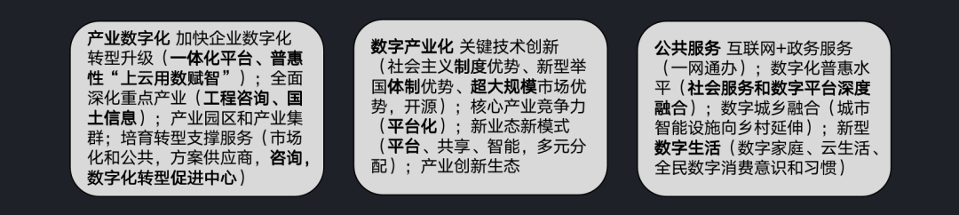关于数字经济,在《十四五纲要》中也提到了三个重要方面——产业数字化、数字产业化、公共服务。这三方面就是企事业单位需要做的事情。