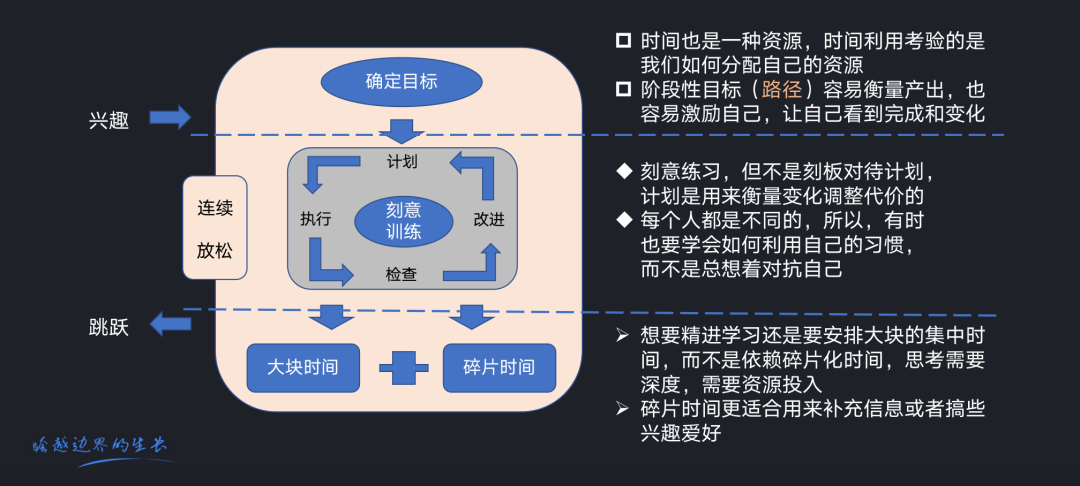 这张图是我自己实践的方式,我比较喜欢用做计划的方式,把时间当成资源投入到我的目标计划中。比如说我曾经接受邀请写一篇关于中台的文章,我把这件事当成一个目标。如何在一到两个月的时间内完成一篇对中台深入分析的文章。计划确定下来后,一到两个月就是一个时间资源投入到我的计划中,我要学习什么,收集哪些资料,有什么产出,确立一个明确的目标。这个过程中,我利用了大块的时间,也利用了碎片的时间,把二者结合起来。
