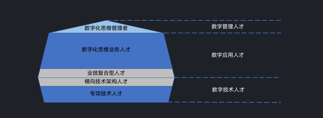 在数字应用人才中,也就是用数字工具的人才中,最多的是具备数字思维能力的业务人才,这类人才再向下沉降,再深入地培养,比如通过业务架构的学习,通过业务架构的思维方式,将其中的一部分培养成业技复合型人才,这种所谓的复合型是能够提出结合业务与技术的解决方案,而不仅仅是提出一些灵感或者思想,要真正能够协助技术侧去完成新业务的设计。