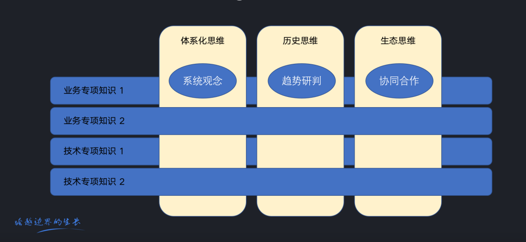 通过纵向的关于思维的认知,把专项的知识提升一个层次,这种编织的方式会让学习变得更有效率,它也是每个人最终成长的路径。最终你会发现,当有一套框架式的体系,学习和吸收任何知识都会变得更快。