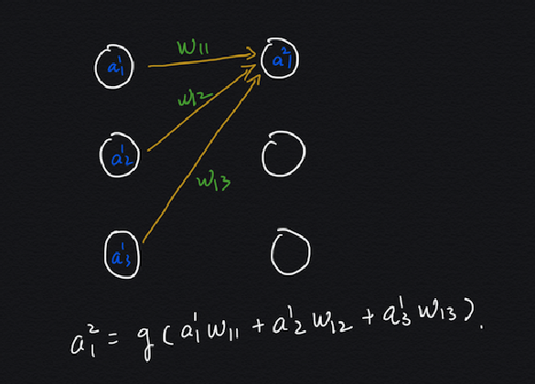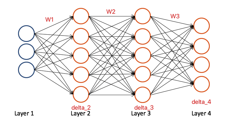 之前学习前馈预测时,我们知道一个激活单元是输入是上一层所有激活单元的输出与权重的加权和(包含偏置),计算方向从左到右,计算的是每个激活单元的输出,看图: