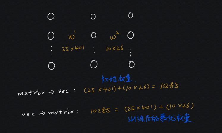 注意上面优化库的输入 X0 = init_theta 是一个向量,而我们的神经网络每 2 层之间就有一个权重矩阵,所以为了把权重矩阵作为优化库的输入,我们必须要把所有的权重参数都组合到一个向量中,也就是实现一个把矩阵组合到向量的功能。