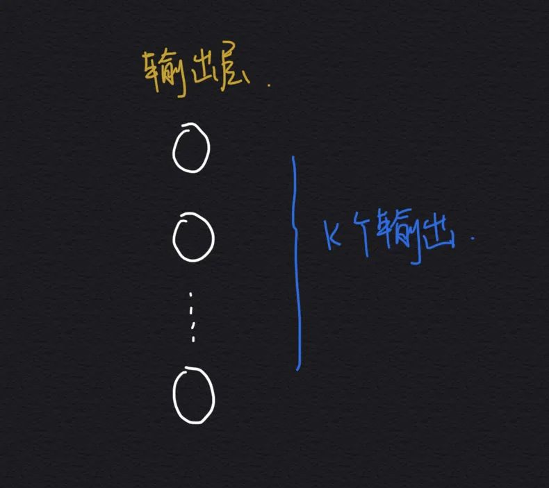 前面讲的简单逻辑回归的只有一个输出变量,但是在神经网络中输出层可以有多个神经元,所以可以有很多种的输出,比如 K 分类问题,神经元的输出是一个 K 维的向量: