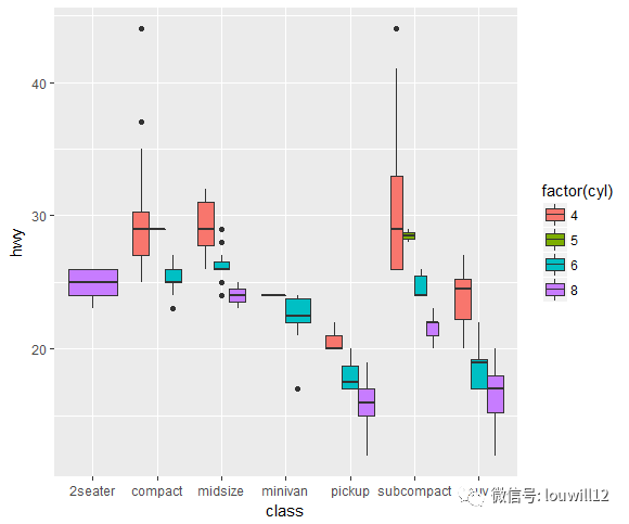 ggplot(mpg, aes(class, hwy, fill = factor(cyl))) +