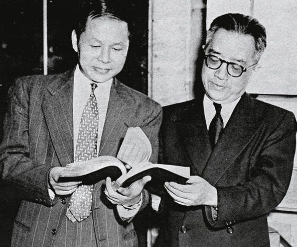 1952年葛思德东方图书馆的两位馆长胡适与童世纲在馆内合影
