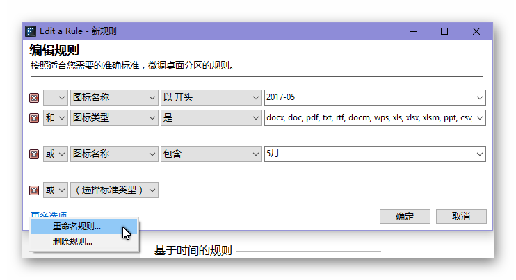 比如我想把桌面上 5 月份的文件都放到一个分区中。我可以通过多个规则的制定,可以把文件按实际需求进行分类、排序。