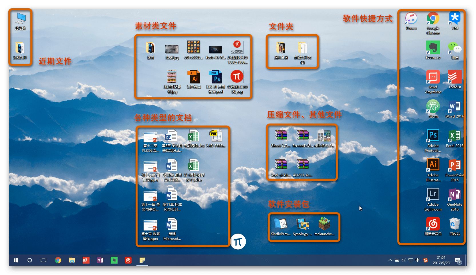 经常用 的文件:这部分文件经常需要使用,不要把它们放在文件夹里,以便随时随地快速调用。如果放进文件夹反而会影响效率。例如:软件快捷方式、需要反复使用的 LOGO 图标。