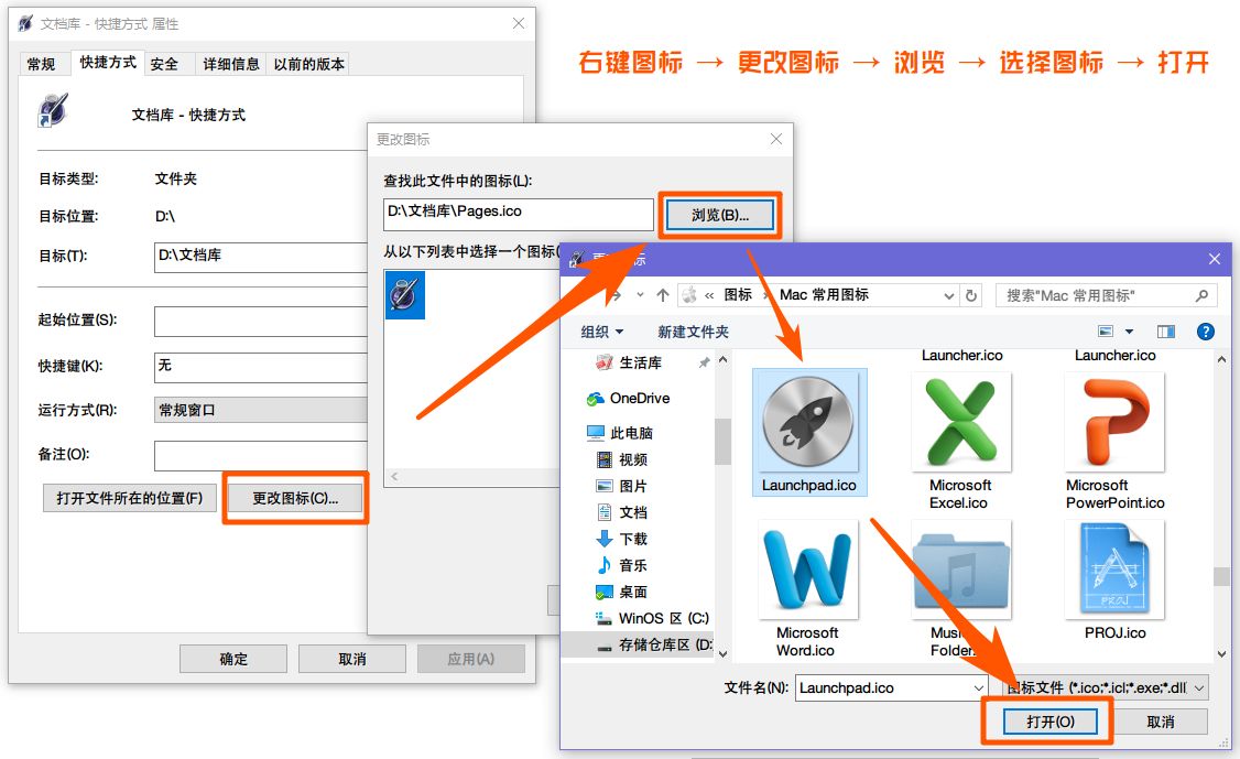 右键 快捷方式 → 属性 → 快捷方式 → 更改图标 → 浏览 → 选择图标 →确定 ,即可更换图标。