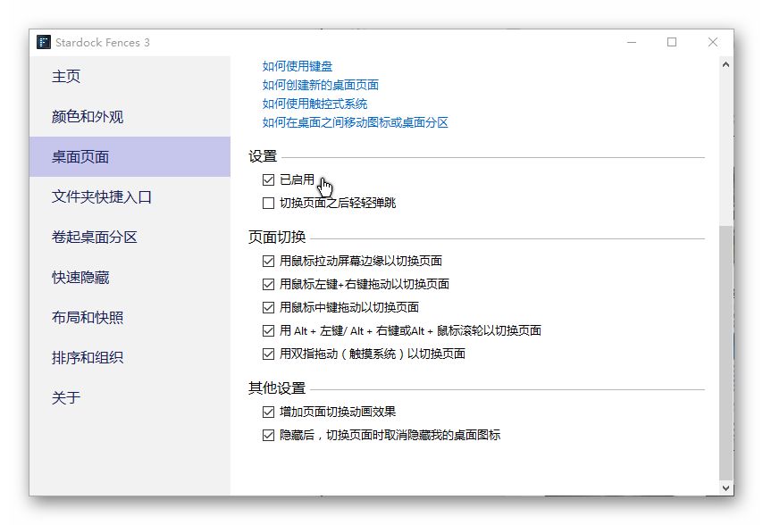 在 桌面页面 中启用,桌面就可以像手机一样,整屏整屏地移动。鼠标在桌面的最右侧往左滑动,或是使用键盘快捷键都可以切换图标屏幕。如果你的电脑有触摸屏,还可以设置为 双指拖动切换页面 ,相当方便。
