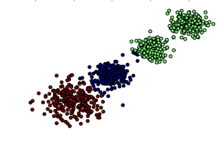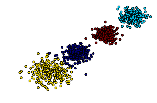 可见k=4的聚类分数比k=2和k=3都要高,这也符合我们的预期,我们的随机数据集也就是4个簇。当特征维度大于2,我们无法直接可视化聚类效果来肉眼观察时,用Calinski-Harabaz Index评估是一个很实用的方法。