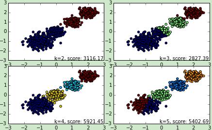 再看看用MiniBatchKMeans的效果,将batch size设置为200. 由于4个簇都是凸的,所以其实batch size的值只要不是非常的小,对聚类的效果影响不大。对于k=2,3,4,5对应的输出图为:
