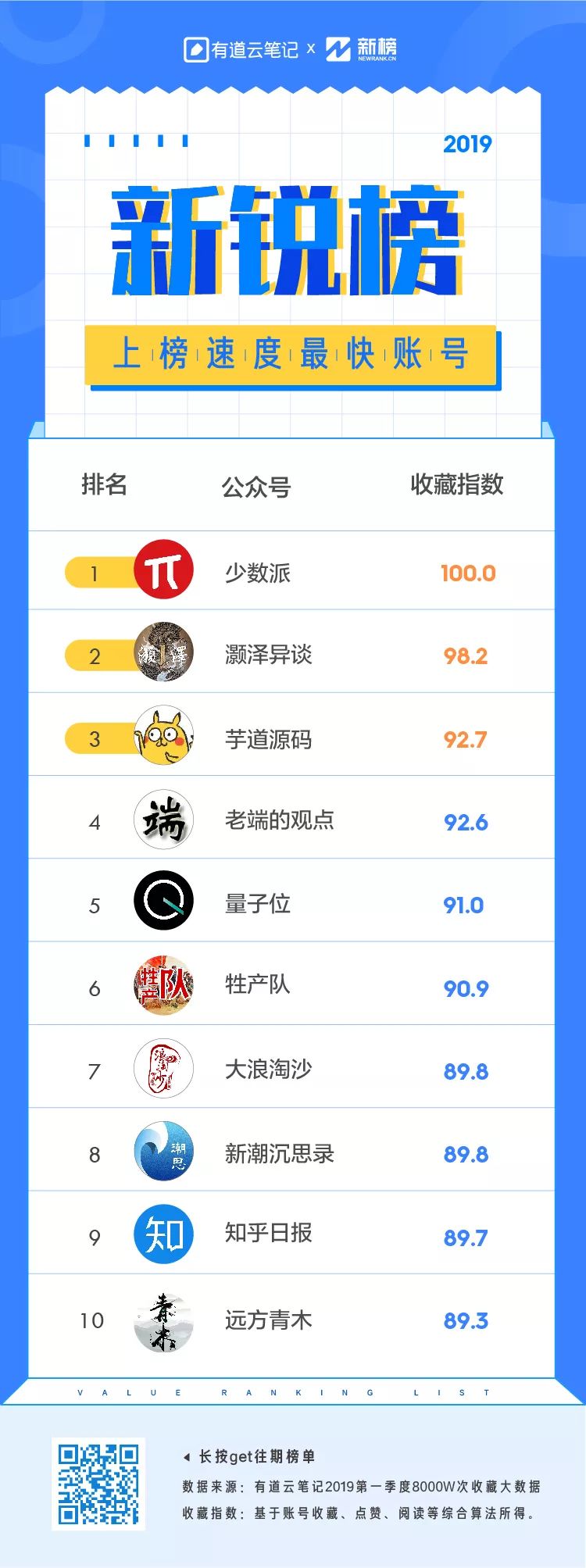 本次新增“新锐榜”,抓取上一季度收藏量攀升最快的Top 10账号,从中不难看出,偏重技能学习,效率提升的「少数派」、「芋道源码」、「量子位」和「知乎日报」等不容小觑,剩余上榜账号则是多维度的信息解读,涵盖财经、时事等领域,如「老端的观点」、「牲产队」等,在复杂信息量中给出更多启示。