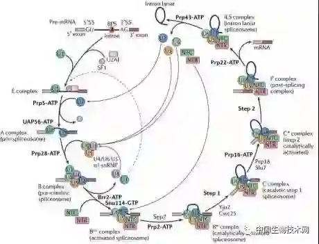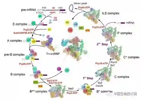 RNA 剪接是真核生物基因表达调控的重要环节之一,负责执行这一过程的是细胞核内一个巨大且高度动态变化的分子机器——剪接体(spliceosome)。从1977年首次发现RNA剪接至本世纪初,科学家们通过免疫沉淀、基因敲除、交联质谱、建立体外剪接反应系统等研究手段,初步建立起剪接体的组装与解聚的发生过程,以及蛋白与蛋白、蛋白与核酸之间的相互作用、相互调控等复杂的RNA剪接调控网络。RNA剪接的本质是两步转酯反应,在剪接反应过程中,多种蛋白质-核酸复合物及剪接因子按照高度精确的顺序发生结合和解聚,依次形成预组装复合物U4/U6.U5 Tri-snRNP(U4/U6.U5三小核核糖核蛋白复合物)以及至少7个状态的剪接体B、Bact、B*、C、C*、P以及ILS复合物(图1)。