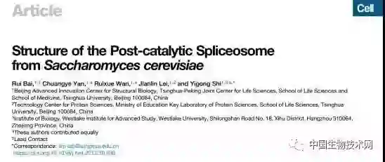 2017年11月17日,清华大学生命学院、结构生物学高精尖创新中心施一公教授研究组就剪接体的结构与机理研究于《细胞》(Cell)杂志再次发表最新成果。这篇题为《酿酒酵母“催化后剪接体”的结构》(Structure of the Post-catalytic Spliceosome from Saccharomyces cerevisiae)的论文报道了酿酒酵母剪接体呈现RNA剪接反应完成后状态(定义为“P复合物”)、整体分辨率为3.6埃的三维结构,首次展示了pre-mRNA中3’剪接位点的识别状态,该结构为回答RNA剪接反应过程中pre-mRNA中的3’剪接位点如何被识别,第二步转酯反应如何发生以及成熟的mRNA如何被释放等关键问题提供了重要的结构信息。
