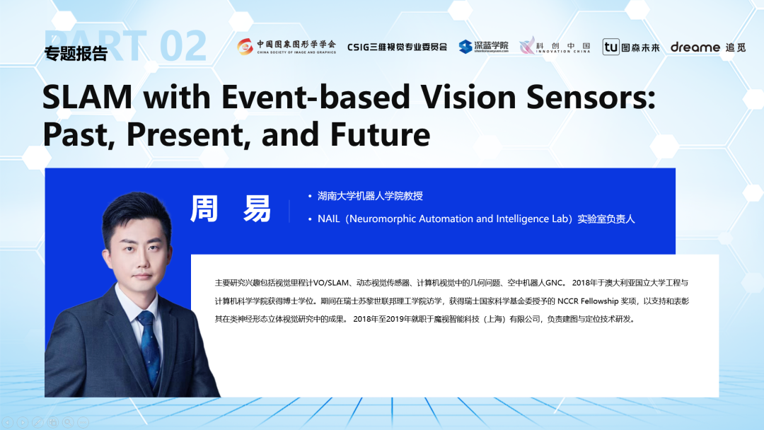 接着,湖南大学机器人学院教授的周易老师带来了“SLAM with Event-based Vision Sensors: Past, Present, and Future”报告,周易老师围绕事件相机在SLAM技术中的应用展开。首先介绍事件相机的工作原理、传感器特性以及常见的应用场景,然后回顾了过去十年内该领域的发展。谢柯老师着重介绍当下几个具有参考价值的系统级工作,并从方法论的高度讨论基于事件的方法需要解决的核心问题。