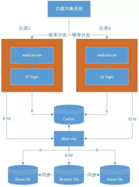 流量上升,计算能力提升的同时,也需要提升数据库的能力。这时候,我们可以采用读写分离。也就有了主从之说。主库可以写,当然也肯定能提供写,从库只能提供读,我们目前主从延时在20ms以内。目前这种工具不少,比如mysql proxy等。(下图应该是ui logic访问dbproxy,图有稍许错误,但是不影响理解)。