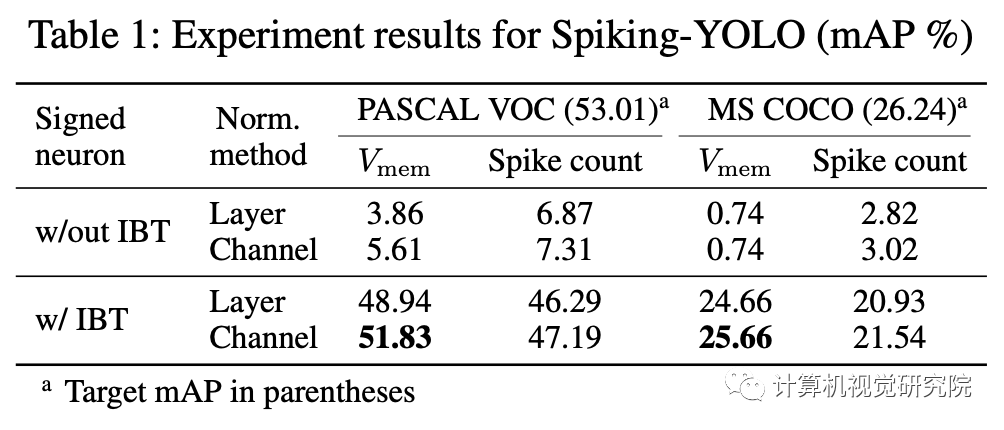 提出一种在深度SNN中能够进行快速精确信息传输的Spiking-YOLO算法。这是第一次将深度SNN成功应用于目标检测任务的工作;