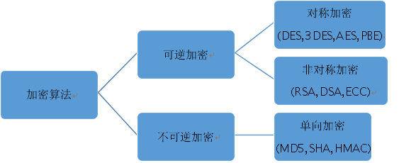 对一些明感的采集数据,需要在数据传输过程中进行加密处理。目前存在的问题是,客户端采集代码比较容易被匿名用户获取并反编译(例如Android、JavaScript),导致数据加密的算法和密钥被用户窃取,较难保证数据的安全性。根据加密结果是否可以被解密,算法可以分为可逆加密和不可逆加密(单向加密)。具体的分类结构如下: