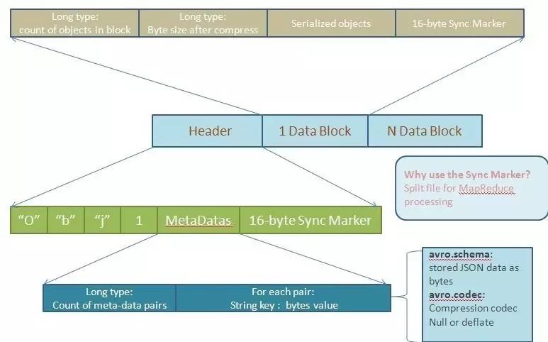 Avro定义了一个简单的对象容器文件格式。一个文件对应一个模式,所有存储在文件中的对象都是根据模式写入的。对象按照块进行存储,在块之间采用了同步记号,块可以采用压缩的方式存储。一个文件由两部分组成:文件头和一个或者多个文件数据块。其存储结构如下图所示: