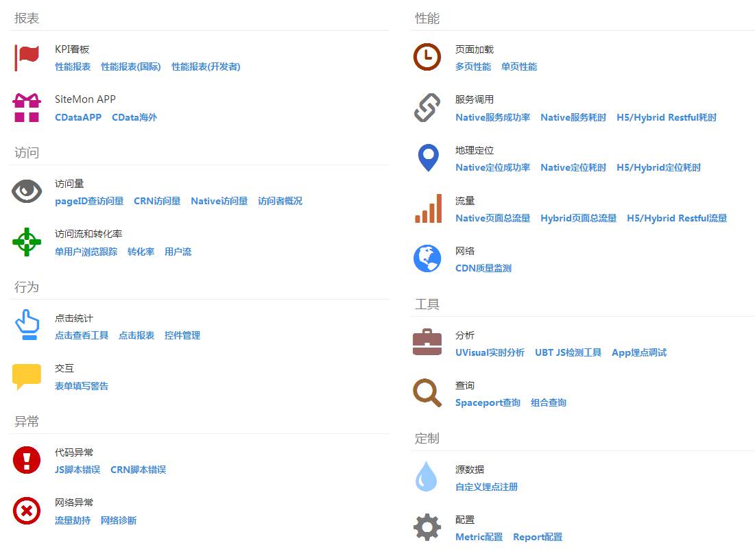 基于实时采集到的用户数据和系统监控数据,我们开发了一套相关的数据分析产品。产品的内容主要分以下几部分:(1)、API和页面性能报表;(2)、页面访问和流量;(3)、用户行为分析;(4)、系统异常崩溃分析;(5)、数据实时查询工具;(6)、采集数据排障工具;(7)、其它。其中详细分类如下图所示: