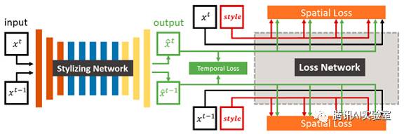 Gatys等人工作虽然取得了非常好的效果,但是缺点是基于优化,非常耗时;到2016 ECCV时,Johnson等人[3]提出了使用深度前向神经网络替代优化过程,实现了实时的图像风格迁移,修图工具Prisma随之风靡一时。但直接将图像风格迁移的方法应用到视频上,却会使得原本连贯的视频内容在不同帧中转化为不一致的风格,造成视频的闪烁跳动,严重影响观感体验。为了解决闪烁问题,Ruder等人[4]加入了对时域一致性的考虑,提出了一种基于优化的视频艺术滤镜方法,但速度极慢远远达不到实时。