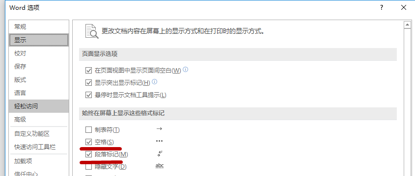 (2)点击左上角的文件,进入“选项”,在“显示”菜单下,把“段落标记”和“空格符”撤销即可;