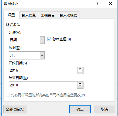 (2)弹出的对话框内验证条件下的允许选择日期,数据选择“介于”,填写好对应日期后返回工作表,这时输入日期以外的信息会收到报错提醒。