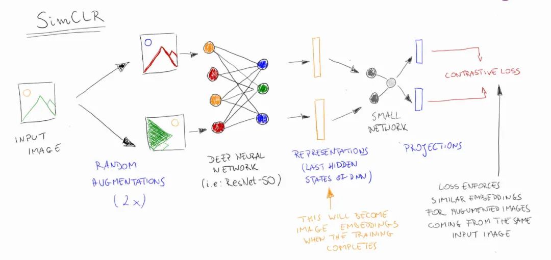 SimCLR 框架所要做的是说,我想学习用一种方式来表示一幅图像的一个局部,使同一幅图像的其他局部具有相似的表示。所以,你要做的是,先截取一幅图像,然后再截取另一幅图像。