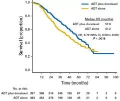 在中位随访时间达到53.7个月时,联合治疗组的中位OS为57.6个月,单独ADT治疗组为47.2个月(HR=0.72; 95%CI为0.59〜0.89; P = 0.0018)。
