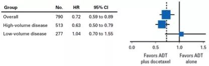 CHAARTED研究是一项III期随机对照试验,790例mHSPC患者被随机分配接受ADT联合多西他赛(75 mg / m2,6个周期)或单独ADT组。研究的主要终点是总生存(OS)。并对前瞻性预设的肿瘤低负荷和高负荷患者进行亚组分析。高肿瘤负荷的定义为存在内脏转移和/或四个以上骨转移,且至少有一个位于脊柱和骨盆外。