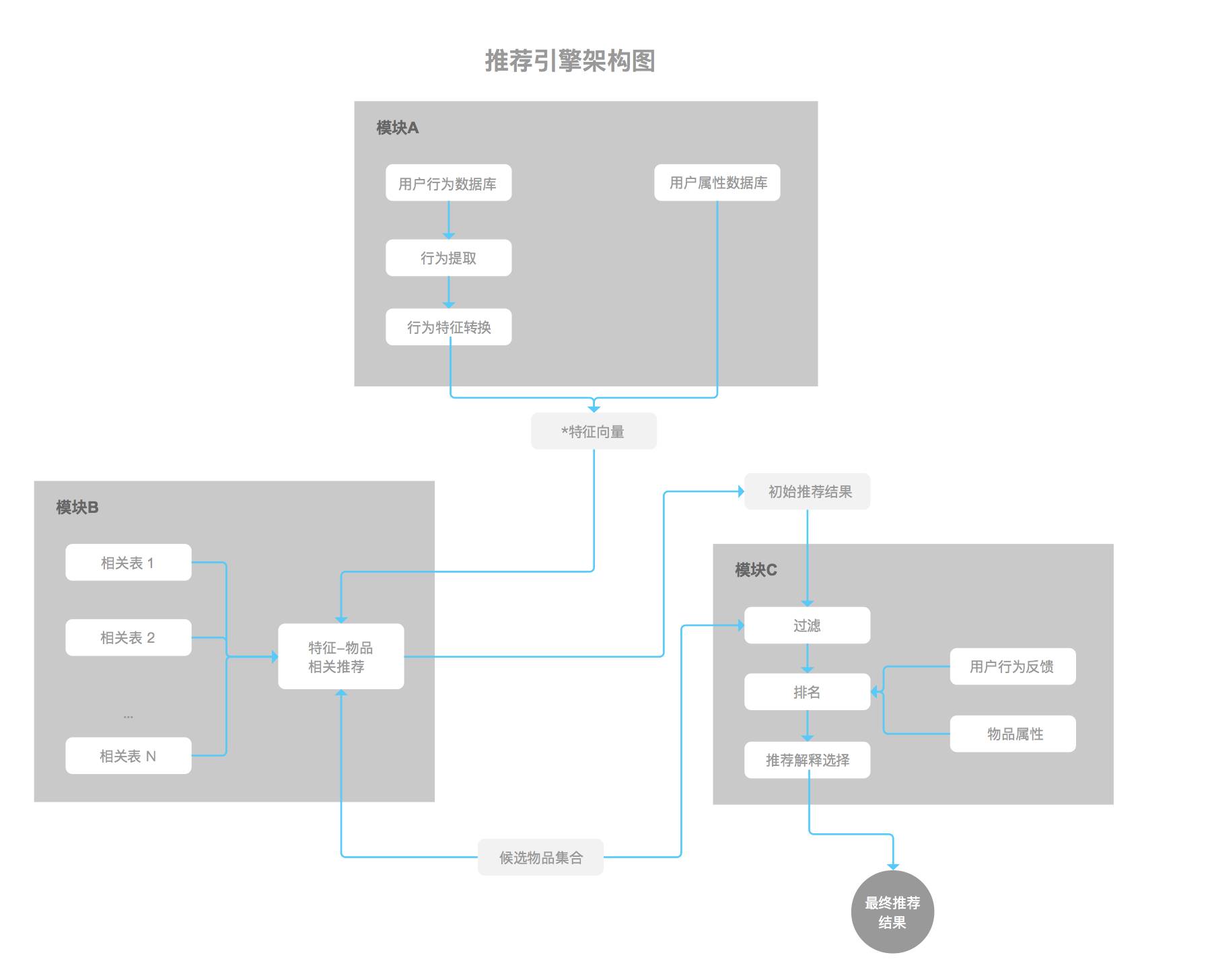模块A:从数据库或缓存中拿到用户行为数据,通过分析不同行为,生成当前用户的特征向量。
