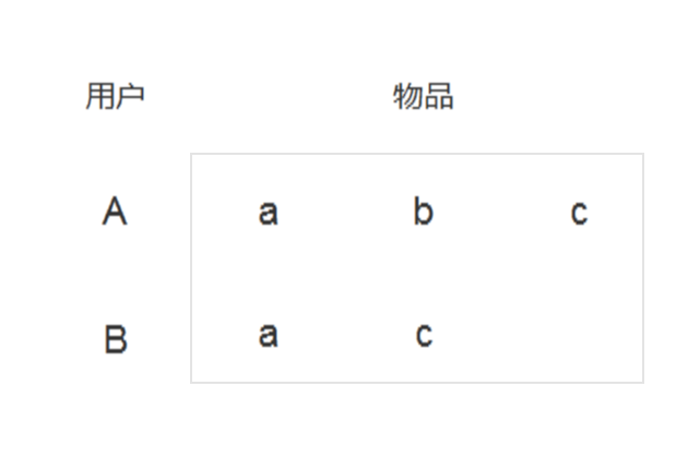 对应的表如下,该表的意思是用户A对物品{a,b,c}有有过行为,对{a,b,c}是感兴趣的,用户B对{a,c}是感兴趣的: