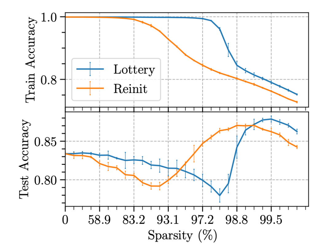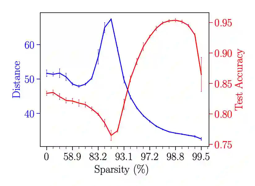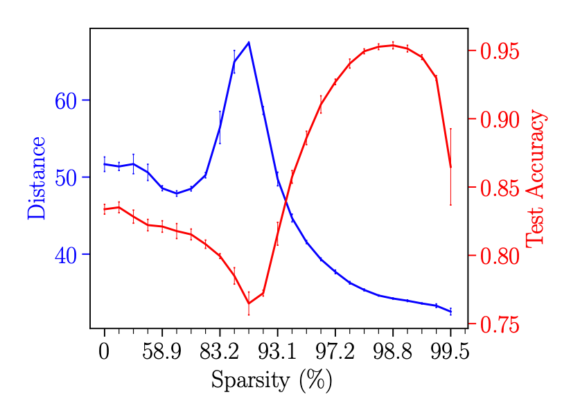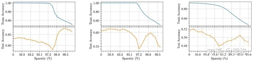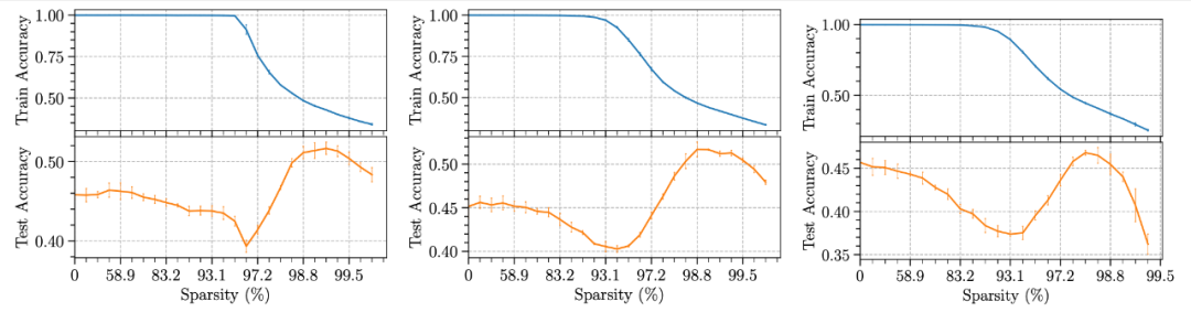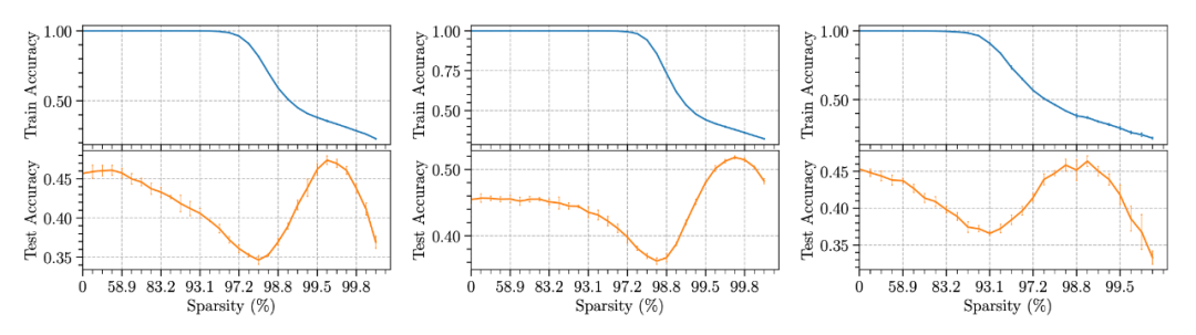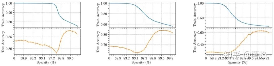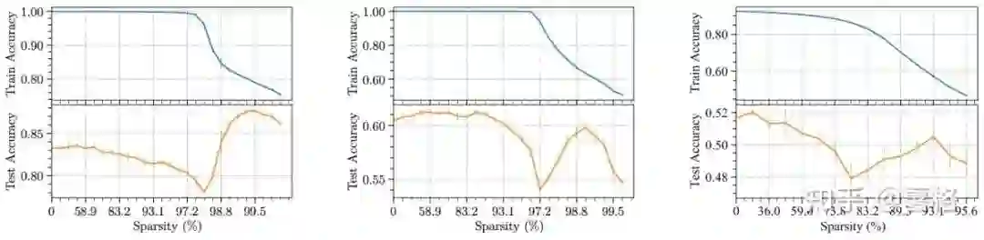 如果进一步的增加模型稀疏度,可以发现当经过某个拐点后,模型的训练准确率开始快速下降,测试准确率开始上升,此时模型对噪声的鲁棒性逐步提高。至于当测试准确率达到最高点后,若继续减少模型的参数,则会影响模型的学习能力。此时,模型的训练与测试准确率同时下降,开始变得难以学习。