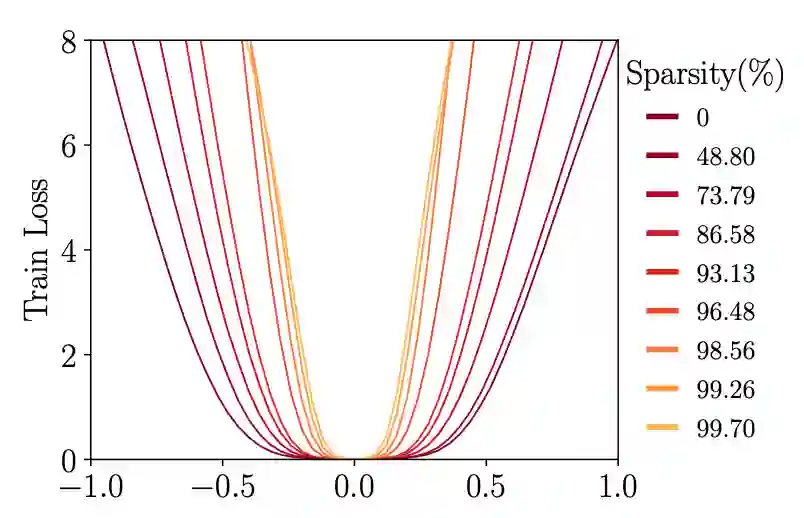 在这里我们主要检验了两种可能的解释。其一是极小点平坦度假说(Minima Flatness Hypothesis)。一些文章指出,剪枝可以为模型增加扰动,这种扰动使得模型更易收敛到平坦的极小点 [5]。由于极小点越平坦,一般会具有更好的泛化能力,因此 [5] 认为剪枝通过影响极小点的平坦度影响着模型的泛化。