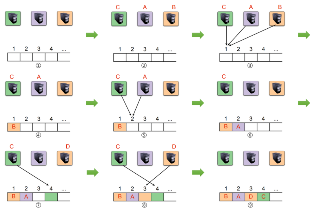 使用Multi-Paxos对一系列值达成一致的流程如图2所示。三个副本,以不同颜色标识,首先进行Leader选举,绿色副本被选为Leader,然后连续提议A、B、C、D四个值: