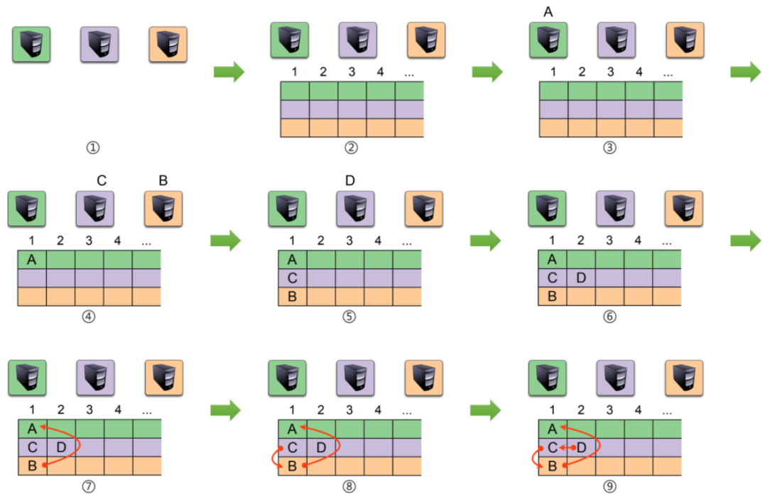 使用EPaxos对一系列值达成一致的流程如图3所示:三个副本,以不同颜色标识,各副本有自己的Instance空间,在各自的Instance中提议自己的值,A、B、C、D是它们提议的值。每个Instance不仅对值达成一致,还对与其它Instance之间的相对顺序达成一致。