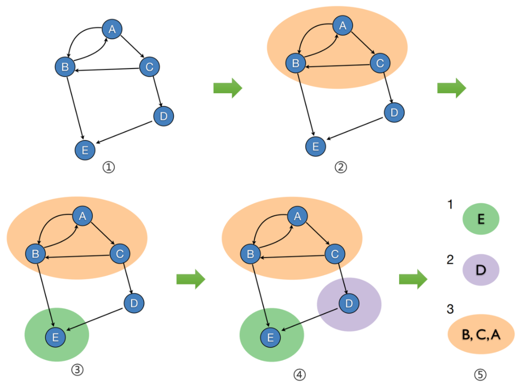 EPaxos对Instance重新排序的流程如图4所示,其中由背景色圈起来的是强连通分量: